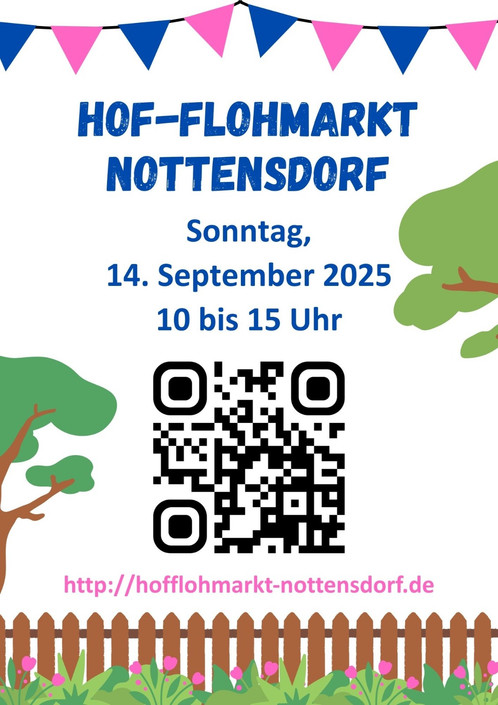 Der Hof-Flohmarkt in Nottensdorf findet am Sonntag, den 14.09.2025 von 10:00 bis 15:00 Uhr statt und die Vorbereitungen bei den Teilnehmern laufen auf Hochtouren. Bereits über 80 Stände sind angemeldet - eine Übersichtskarte ist unter https://hofflohmarkt-nottensdorf.de/ verfügbar. Wir freuen uns über die hohe Beteiligung und hoffen auf gutes Wetter und viele Besucher.