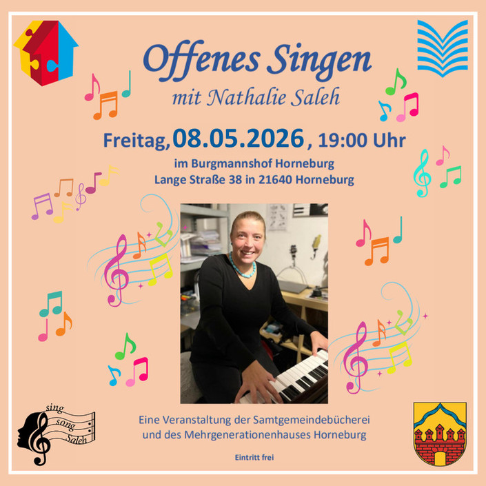Ein netter Abend für Jung und Alt im Burgmannshof Horneburg. Gemeinsam wollen wir unter Anleitung von Nathalie Saleh Lieder aus allen Bereichen singen, von Hits über Evergreens, Schlager oder Volkslieder. Für jede sangesfreundliche Kehle ist etwas dabei.