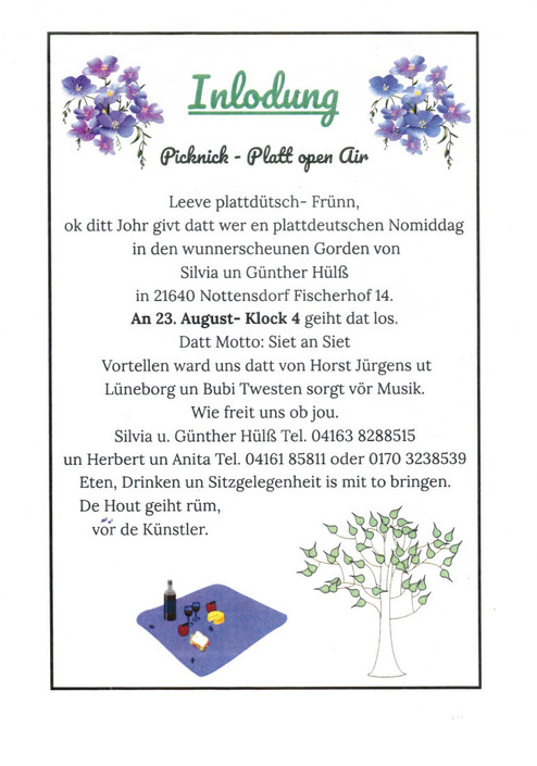 Liebe Nachbarn, Plattsnacker und solche, die es werden wollen, am Samstag, dem 23. August 2025, um 16.00 Uhr veranstalten wir wieder einen plattdeutschen Nachmittag mit „Plattsnacker und Gesang“ aus der Region. Die diesjährige Veranstaltung steht unter dem Motto „Siet an Siet“. Vorgetragen von Horst Jürgens aus Lüneburg und musikalisch begleitet von Bubi Twesten.