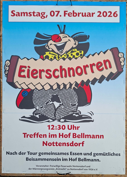 Es ist wieder soweit, unser traditionelles Eierschnorren findet am 07. Februar statt. Zum Auftakt treffen wir uns um 12:30 Uhr im Hof Bellmann. Danach startet die Tour bei hoffentlich trockenem Wetter mit musikalischer Begleitung durchs Dorf.